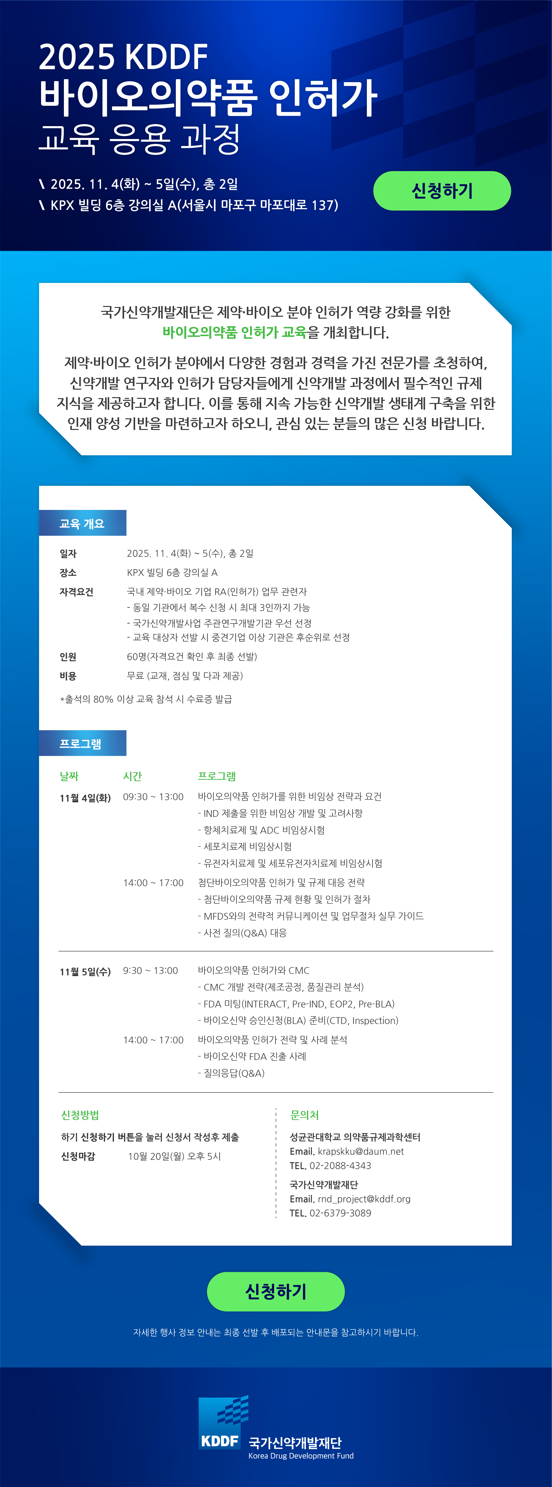 사업공고 [KDDF] 2025 바이오의약품 인허가 교육응용 과정 관리자 2025-09-29 조회수 173 2025 바이오의약품 인허가 교육응용 과정국가신약개발재단은 2025 KDDF 의약품 인허가 교육 프로그램을 추진하고 있습니다.이에 따라 신청 인원 모집 및 프로그램 홍보를 하오니 관심 있는 분들의 많은 참여를 부탁드립니다.신청 접수 기간: 2025.9.29.(월) ~ 10.20.(월) 목록 이전글[한국연구재단] 2025년 한-뉴질랜드 공동연구사업 추진을 위한 연구자 온라인 워크숍 안내 (10/2(목), Zoom미팅) 다음글[한국연구재단] 호라이즌 유럽(Horizon Europe) 과제 수행을 위한 행정업무 설명회 안내(10/16(목), 대전/온라인)